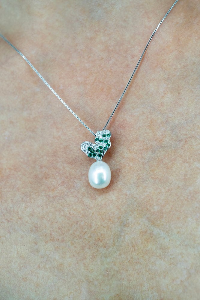 Nature-inspired and elegant, the Emerald Leaf Pearl Necklace features a sterling silver pendant in a delicate leaf shape accented with a green stone and 8–9mm freshwater pearl. Paired with a sterling silver chain, this necklace blends organic charm with timeless sophistication, making it perfect for both everyday wear and special occasions.